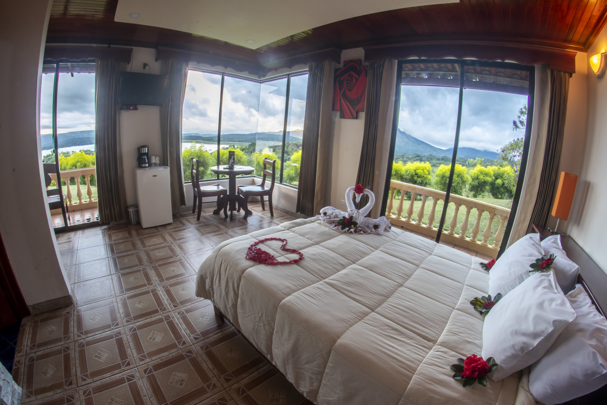 La habitación cuenta con una cama queen, aire acondicionado, mininevera, bañera, secador de pelo, cafetera, terraza privada, televisión por satélite, caja fuerte con wifi y estacionamiento privado. La habitación tiene una vista perfecta del Volcán Arenal y el Lago Arenal.